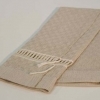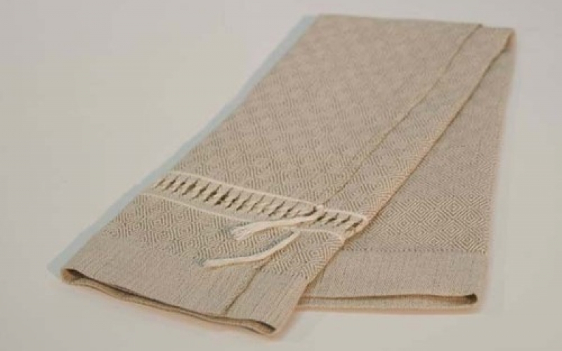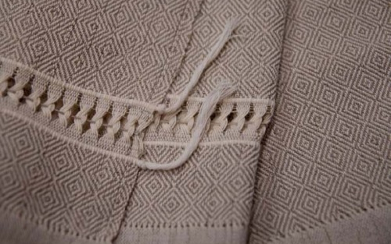 Asciugamano singolo tessuto a mano. Motivo decorativo: lavorazione a spina con garza a giro inglese tessuta. Ordito in cotone, trama di fondo lino greggio. Rifinitura con orlo a giorno ricamato a mano sui lati corti e tessuto a cimosa sui lati lunghi.